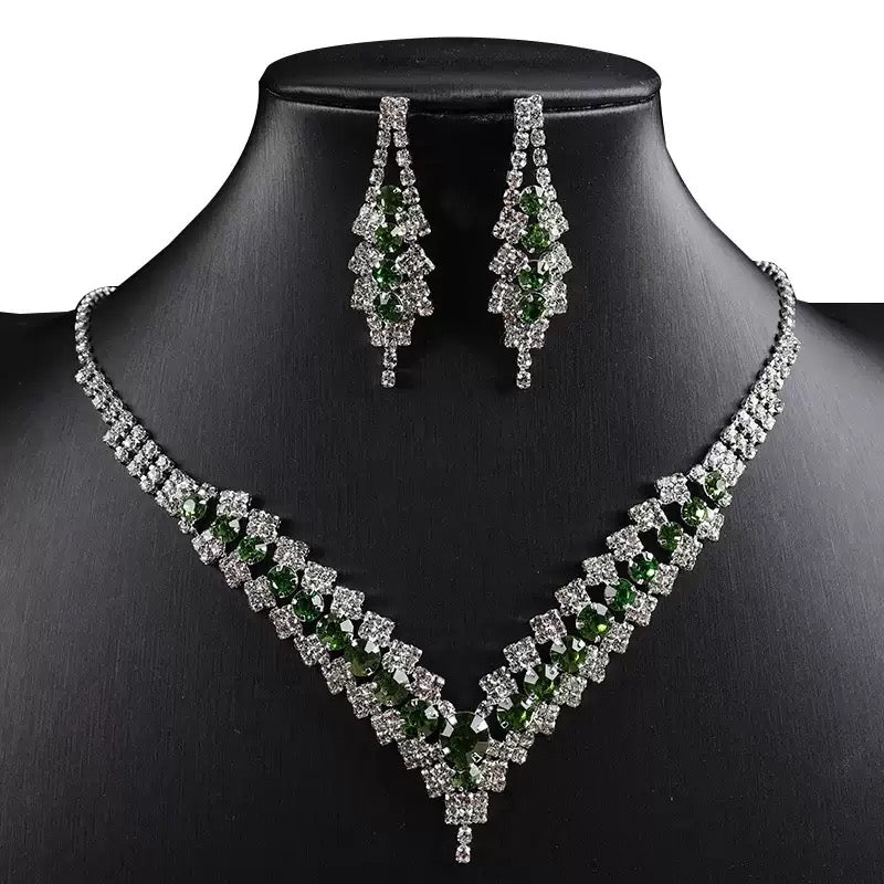 Luxury Crystal Necklace & Earrings Set – Bridal & Party Jewellery (Green, Clear, Blue, Black)