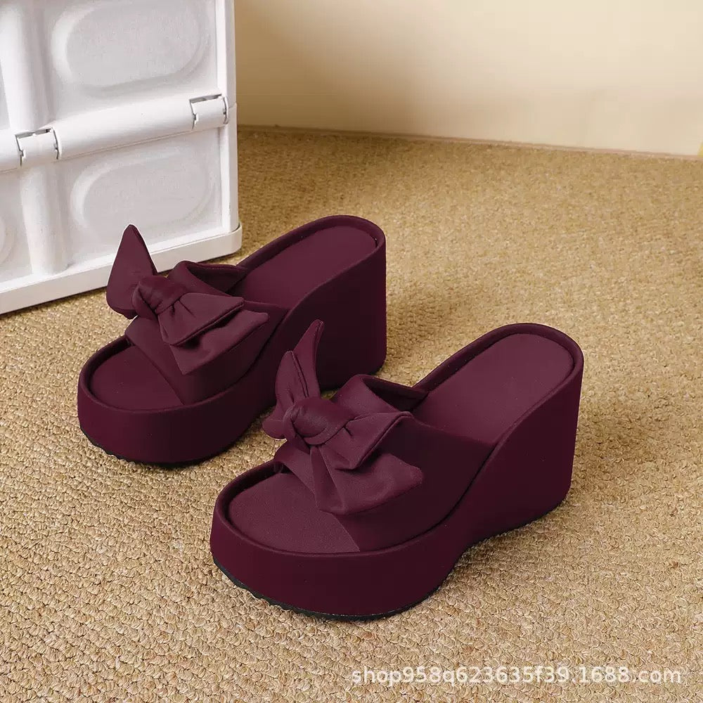 Sweet Bow-Knot Lycra Slippers, Thick-Soled Wedge Heel Open-Toe Sandals